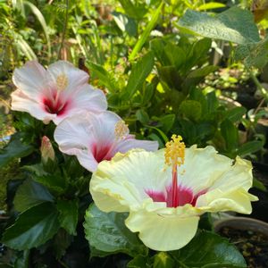 嬉しい〜💖🤍💛 1番花が咲き終わり、花がない状態の 処分価格だったハイビスカス🌺 100えんだったかな? 色に迷ったので、この価格ならと 3種買いましたー😅 あまり、期待はしてなかったけど 小さい背丈に大きな花にビックリ‼️ 花が開いた時、 デカ❣️っと思わずつぶやきました😅 なんか、かわいい😍 3種3様の色で綺麗❣️ 買って良かったと思いました🤗 が、さてさて冬越しできるかな? と今から心配してます🫤