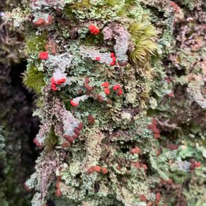 コアカミゴケ…❓ 神社のスギの木に張り付いていた 地衣類というものらしいのです。 赤色と赤茶色があるのですが 単に色違いなのかしら…🤔 ご存知の方、教えてください🙇🏻♀️ コアカミゴケの投稿を見る限り赤色はあっても赤茶色のものがないんです。 ハナゴケ科ハナゴケ属