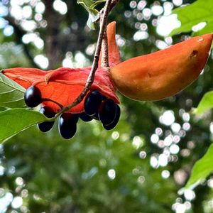 熟すと朱紅色になり、 径2㎝の種子はナッツとして 食べられるそうです🥰 中国南部・インドネシア半島が原産 🏓を想像しちゃいます。