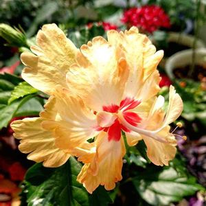 庭の鉢植えのハイビスカス 🌺 (二段咲き ロサ シネンシス) 😳 ニダンザキ 😳 伊良湖岬のハイビスカス(8月2日投稿)と 🌿 寄せ植えしてあります 雄しべが花びらのようになることで 花が二段で咲いているように見えるそうです😳