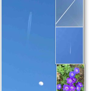 15:20分の空月と雲 飛行機雲はあっと言う間に消えて ポッンと残る月 寂しげに! なにげなく 見上げた空に 月と雲が 互いの美を 競いあいて 上 2/10 10:16分 下 “ 10:25分 昨年の10月の撮影 万博公園の薔薇のそばに 咲いていた ゲラニウムロザンネ