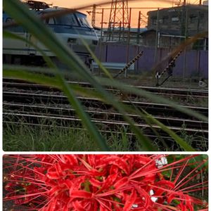 17:35分 暮れなずむ 操作場 髪をカットした帰りに 柔な夕陽に出会えました 機関車も🚂 黄昏ている 佇みて