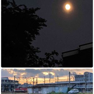 6:08の女神さま 赤々としてまるで太陽かと 見間違える様に赤く 輝いて 下はお買い物帰りに撮った 夕焼けですね 機関車の🚂操作場から撮りました 今宵の月🌖 赤く燃える 東の空🔥 星はまだ✨⭐️ 瞬き忘れ どこいずる✨⭐️