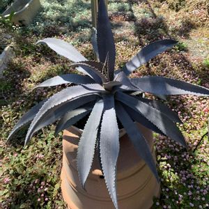 PWマンガベ・シルバーフォックス 室内管理に限界を感じるサイズなのでお外デビューして貰いました。 葉が長いのはやはり徒長? 株の直径4〜50センチはあります。 これはこれで良いけどこれからは締まった姿に育って貰います。 近いうちに植え替え予定だけど葉が大きくてトゲもカチカチで痛い!