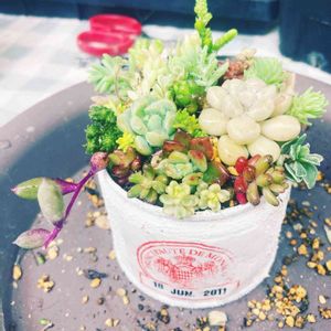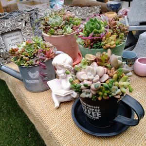 こんにちは(*ˊᵕˋ*)多肉植物の寄せ植えいろいろな鉢で作りました🤗(´•ᴗ• ก )՞ ՞