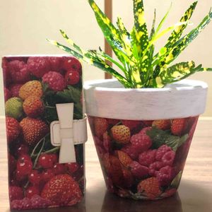 久しぶりのデコパージュ 初めて素焼き鉢にしました✌️🎶 左上 フォーカリア四海波 花芽らしきものが✌️ どんなお花が咲くのかな❓ 楽しみ✌️🎶💕