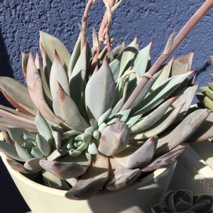 朝7時前。 暗い。。 気温9℃。。 夏に虫にやられたり食べられたりで下葉はめちゃくちゃで形も悪い名無しエケベリア。 暗いから玄関前の灯の下で。 春にカットします!