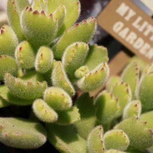 これもモフモフほひと鉢。「ファング」ベンケイソウ科・カランコエ属。これは葉の裏面に特徴がありますね。突起が複数でています。🐊ワニの背中のように。