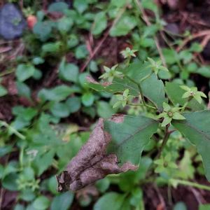 軽井沢の林の全く日当たりのない場所でみつけました。ツルで広がっています。花は終わったのか、これが花なのか?花は1cm、葉っぱは大きいもので8cm位、下の方の葉は丸みを帯びて小さいです。 名前のわかる方、宜しくお願い致します‼️