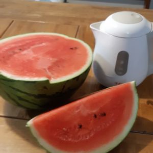 夕食のデザートに切ります ケトルは大きさ比較 高見沢すいか 大きいですよね。 4文の1切ったのですが その半分で私の夕食の 分量😄 前一度頂いて すっかりファンに。 夫婦ふたりで完食します。