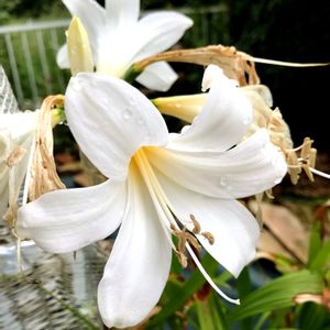 ペラドンナ リリー 白鳥 植えて三年目、葉っぱは出るけど花は咲かない ↖️8/29 7月に葉っぱが枯れて何もなかったのにあれ〜~⁉️ ⬆️8/31 急に成長して40㌢ ➡️9/1 開いて蕾が見えてきた ⬇️9/5 今朝開花 花の中が黄色で綺麗なんです 香りありとあるけど、私には❓️です 蕾がまだあるので、次々と咲きそうですね 本種が本当にのアマリリスという意味で ホンアマリリスという和名がついてます 三年咲かなかったので、チューリップの球根を植えるのに、もうポイしようかと思ってたのが伝わって咲いたか⁉️ 来年も咲くのか、また2~3年待つのか、長い👀で見守りでしょうか?