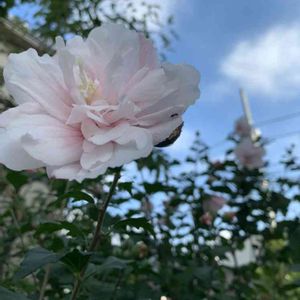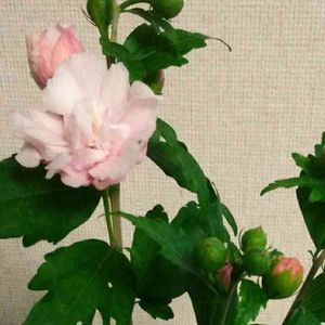 庭のムクゲが咲き始めました。 ピンク色の八重咲きです。 新しい花を次々と咲かせ秋頃まで楽しませてくれます。