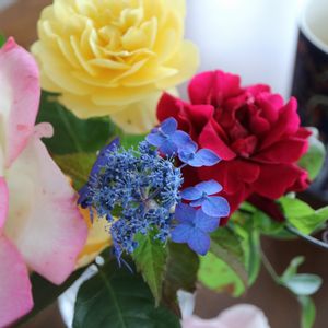 おはようございます。 やっと晴れました☀️ 紫陽花と薔薇の組み合わせはこの季節の贈り物ですね🥰