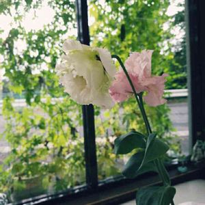 保険屋さんに頂いたお花です。 会社のテーブルに一輪挿し❤ 一本の茎から、白とピンク色の花が(#^_^#) この子の名前、ご存じでしたら教えてくださいm(_ _)m