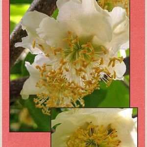 今日のお花🔸キウイ🔸 ① 花は5月中旬頃に🤗 雌木3本に雄木1本を植えて十数年、毎年良く実ってくれます🥝 ② 摘果をしないので、こんな有り様ですが…🤭 ③ サネカズラも雄木と雌木があるそうですが、我が家のは雌雄同株で両方咲いています🎶
