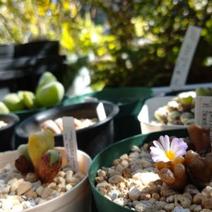 本日2枚目は……1日遅れのおけつの日(?😂)っぽいメセンの仲間です🤗💕 (両方とも The Farm Universal Chibaさん出身です♡) どちらもハマミズナ科の多肉植物と言うのが正式なのだろうけど、メセン(女仙)と呼ばれるのは、サボテン(仙人掌)に似た女性的な植物ということらしいです👀 この子達が興味深いのは、年に1回『脱皮』して、中から新たな葉が出てくるところ😳❣️ 多肉植物さんには、色んな成長の仕方があるんですね〜😲🔰 リトープスさん(左上)なんて、自生地では石や砂利に『擬態』していて、透き通った天窓から取り込む光で光合成してる……というのだから、本当に動物的な感じがします🦚(@_@。 我家の瑞光玉さん(左上)はそんな窓にできる線模様が特徴で「デンドリティカ」(ラテン語で、木のように枝分かれしたの意味)と呼ばれているみたい🌲🌳 コノフィツムさん(右下)も、やっぱり動物に食べられないように葉茎が一体化した形になっていて、足袋型、丸型、鞍型と……現地の環境に合わせて『擬態』しているんだそう( ˙◊˙ )‼️ 窓の紋様や肌色もバリエーションに富んでいるみたいなんだけど、園芸植物としては 赤っぽい色の子が人気あるらしいです♥️ 私のお迎えしたペルシダム・テリカラーという品種にも赤っぽい子もいるみたいなんですが…… 我家の子はどう見ても宇治抹茶色だなぁ〜😅🍵 (この色も渋くて私は好きですけどね😉💕) とりあえず、どちらもGSの先輩方のように綺麗なお花🌸を咲かせられるように…… 頑張って育ててみるつもりですp(*^-^*)q