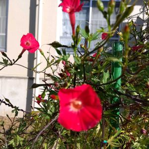通勤途中の塀を彩るマルバルコウ❤️ ビビットな色が目を惹きます と、数年違う名前で覚えていましたが、メリーさんに羽衣ルコウソウと教えて頂きました 変更させていただきます 今日はまた夏日ですね〜 この気候に、この花が似合うかも
