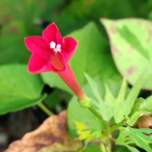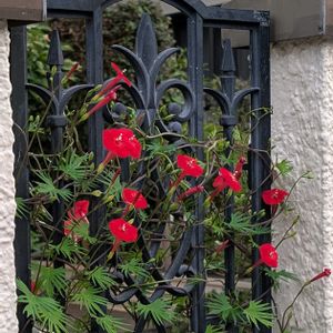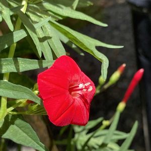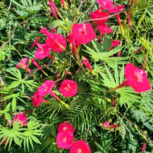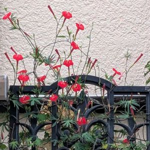 ハゴロモルコウソウ 別名 モミジバルコウソウ 1年草、つる性、種を取って6年咲いてくれてます✨ 鮮やかな赤色の花ですが、1.5cm程の可憐な花とモミジのような葉、華奢なつるが爽やかで清涼感があります🌞 夕方には花がアサガオのようにしぼみます(ヒルガオ科) 母宅(鹿児島)