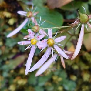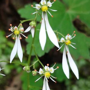 1⃣2️⃣☆今日のお花☆ ダイモンジソウ[大文字草] ユキノシタ科、属 山間部の養魚場に咲いていました 園芸品種だと思います わが家のダイモンジソウは暑さで葉が小さく花は望めません 3️⃣4️⃣5️⃣カラスウリ[烏瓜] ウリ科カラスウリ属 北海道~九州に分布 葉に粗毛が密生し光沢がない 花は日暮れから咲き始め、夜明け前にしぼみます 雌雄異株
