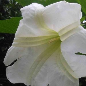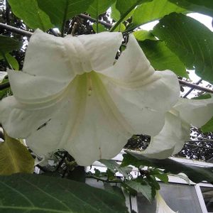 キダチチョウセンアサガオ 大きな葉 大きな花。 20㎝以上はあるな。 フレアースカートの裾を広げて、咲いてるよ。 1日花の朝鮮朝顔は、2日も咲き続けている。 この花も、何日か咲き続けるのかな? 残念。 調べるのは、無理だな。 原産地。ブラジル、エクアドル。