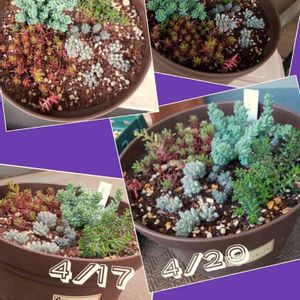 セダム丼3号の成長記録🎵 4/7に二和園さんから購入したマジョール、ブルービーン。 同じ日にカインズさんで買ったコーラルカーペット2種。 約3週間の成長を2回に別けて投稿します。 最初は6号鉢がスカスカだったなぁ😅