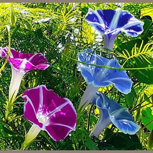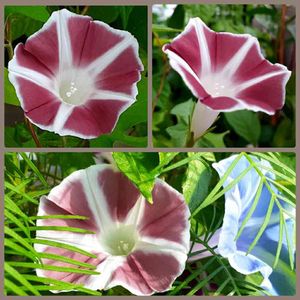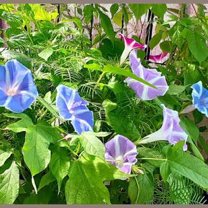 今朝の朝顔 五色四十三輪 咲きました 今朝は茶色の花色が 3輪咲きました これからたくさん咲いてほしいな!