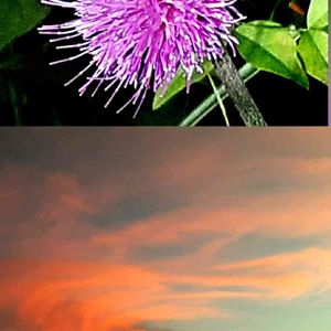 今日もお疲れさまでした アザミの花が綺麗でした 先ほど18時頃の夕焼け空です ダイナミックな雲模様 月は沈んでしまい 星が見えてます