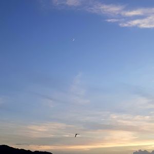 番外編で失礼いたします 雲の中に沈んでいった夕陽でした 18時過ぎの空は夕焼け雲となり 追いかけるように白い月🌒が見えました 鳥さんたちも夕陽に向かってます どうぞ過ごしやすい9月になります様に!
