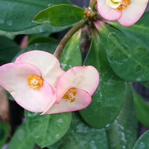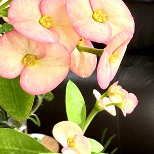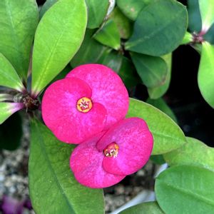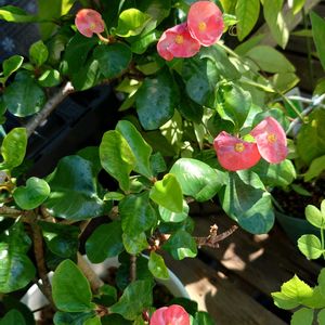 ハナキリン(シャインキッス) トゲなしハナキリンです 年中咲いてくれるとても良い子です 夏は外置きで光によく当たるので濃いピンク 冬は屋内に取り込むので光が足りず白か薄ピンク 一年中楽しませてくれます