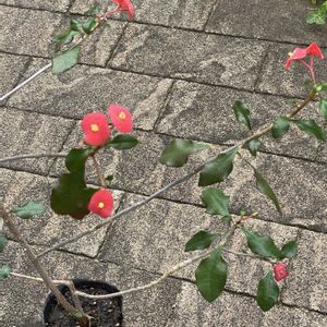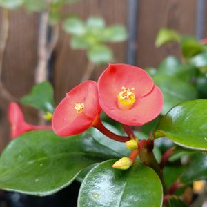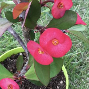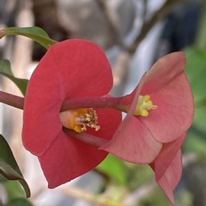 今日のお花 『ハナキリン』 ポインセチアもトウダイグサ科ユーフォルビア属で同じ仲間だそうです😆🎵🎵 我が家のはトゲなしで三年目になりますが、春に剪定し忘れて若干暴れ気味です😅