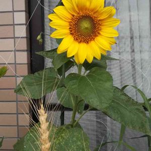 ヒマワリも咲きました。夏らしく元気を貰えます。 手前の小麦で謎のコラボレーション。