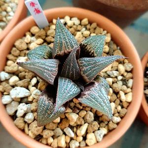 ハオルチアSP実生交配種2021.1.31ヤフオク この仔はピグマエア×オブツーサ…あとは…? 葉先の模様がとても可愛いらしい!(*´﹀`*) 葉っぱザラザラしてます。