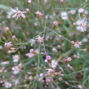 🌱野に咲く小さな花🌱 夏から秋にかけて 茎の先に 小さな頭花を多数付けます。 花は直径約6mm(ちっちゃ) 花後は 綿毛(冠毛)を付けた 種子を飛ばして繁殖します 箒菊(ほうきぎく) キク科