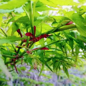 なんだろ? ぷっくら膨らんでて もしかしてつぼみかな〜? 、、、て思ったのだけど よく見たら新芽みたい☺️ もみじ?って 新芽の集まりが花びらみたいにして赤いのに包まれて出てくる感じなんですね 陽射し越しで撮影するとこんなにも鮮やかなグリーンなんですね