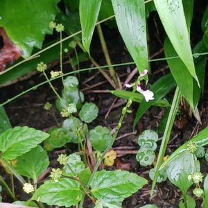 草陰に咲いていた花 →ハエドクソウ ハエドクソウ科 ハエドクソウ属 ←オオチドメ 葉の上に高く花茎が出るのがオオチドメと知りました ウコギ科 チドメグサ属