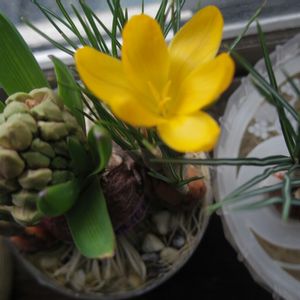 イエロークロッカス🌼も咲いた クルクル葉っぱ可愛い ムスカリとチューリップ🌷は それぞれグラスにお引っ越し 🌷はまだ先のようです☺️
