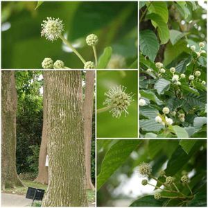 旱蓮木(カンレンボク) ミズキ科カンレンボク属の落葉高木。中国中南部原産で大正時代に渡来した。庭や公園に植えられる。花期は7~8月、枝先に頭状花序を3~5個つける。黄白色の小花が球状につき花柱が目立つ。果期は9~11月。果実は痩果で、バナナ形の果実が球状に集まり淡黄褐色に熟す。果実のひとつひとつに翼があり角ばっている。根、果実などにアルカロイドを含む毒性の強い成分がある。中でもカンプトテシンの毒性反応が強く、肝臓に強く毒性が及ぶという報告がある。抗がん剤や抗白血病薬に用いられ、胃がんや直腸がんなどに効果があるともいわれる。 高木になることから中国では千丈樹、旱蓮木の名があり、和名のカンレンボクは中国名に由来する。また、キク科の高三郎(タカサブロウ)の別名にカンレンソウ(タカサブロウを乾燥させた生薬名)があり、本種の花が似ていることから、カンレンソウに似た木でカンレンボクの名がついたという説もある。別名の喜樹(キジュ)は生長が早くすくすく伸びることを喜んだ名前。 出典『都会の木の花図鑑』『樹に咲く花』