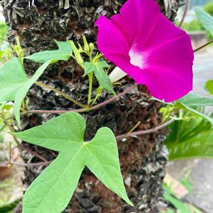 アサガオ(朝顔) おはようございます☀ 今朝はちょっと蒸し暑い朝です! 日中は真夏の暑さになりそうです🥵 ソテツに巻き付いた蔓に今朝は赤紫の綺麗な花を沢山咲かせています☘️
