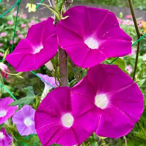 アサガオ(朝顔) おはようございます🌥 今朝は曇り空ですが薄日が差しています☀️ 今日一日こんな天気のようです🌥 今朝は三色の朝顔が並んで咲いています💙❤️💜 とても綺麗です💖