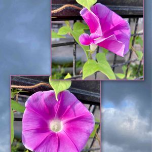 おはようございます 昨日の朝の空とアサガオ 花びらが時折の風に舞っていました