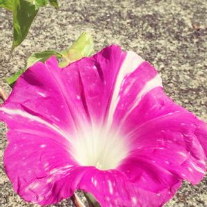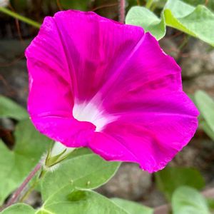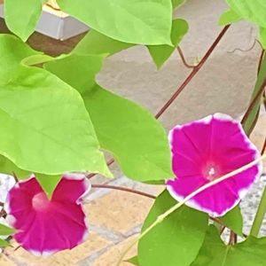 雨の朝、 アサガオが優しく咲いていました💕 この色、今年初めて🎶 一番好きな色✨ 追記 花友さんから団十郎では? と教えて頂きました。 結局今年、この一輪咲いただけでした😓 種も出来ず来年は無理かな。。