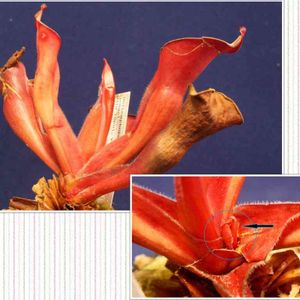 どうでもいいことですが、ついでにヘリアンフォラ サラセニオイデス、プルプラセンス、その交配種 上段左は最近やっと親葉が出始めたサラセニオイデス(H. sarracenioides)、下段右はプルプラセンス(H.purpurascens)。両方ともプタリ テプイ(Ptari Tepui)の同じような場所に生えているそうです。両者は自然交配が進んでいるということで、上段右と下段左はサラセニオイデス×プルプラセンス。上段右はかなりサラセニオイデスに近い雰囲気が出ています。ちなみに上段右の真ん中あたりのピッチャーに白い斑点があるのは病気ではありません、ピッチャから分泌した蜜が固まったものです。