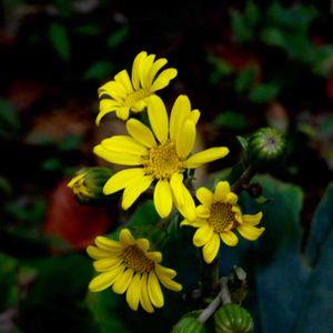 ツワブキの花がようやく咲き始めました😉 夕方に撮ったら、黄色が一際目立った😅