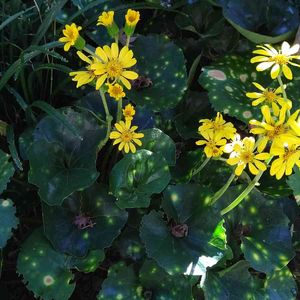 『石蕗』ツワブキ 数カ所に植えている中で、一番日当たり不良の場所で一番元気な石蕗です😍 お花は変わりないのですが葉っぱが大きくて、3~4倍はありそうです😅 その分お花が例年より少ないかな😓