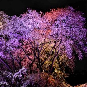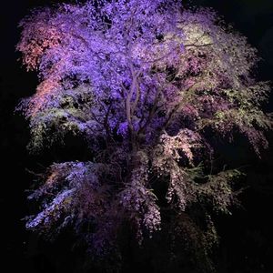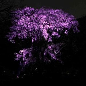 六義園にて 鶴姫のシダレザクラ 先程のpic は六義園へ入ると直ぐの所に有りますが奥に進むともう一本第二のシダレザクラが有りました。鶴姫のシダレザクラと名づけられています。 ライトアップ💡にいろんな色を付けて幻想的な演出をしていました😃 📷 2019.3.28