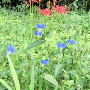 ブルービー 彼岸花の蕾の向こう、キツネノマゴの蜜がお気に入り♡