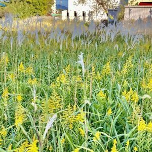 陽が傾き始めた午後、近所を🚲で走っていたら… セイタカアワダチソウ💛とススキ🌾が 風に吹かれて楽しそぅにハミングしていました🎶