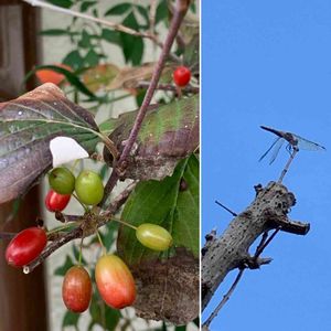 サンシュユの実がグリーンから赤に染まっていくのを見れて嬉しくて🥰 いつも気がつくと変わっているので、今年はゆっくり観察中です♪ 赤トンボがまたまたやってきてくれました 少し離れて止まっていた2匹 (画像は1匹のみ) デートのお誘い中かな? 眺めていたら2匹でクルクル飛び回りながら去っていきました
