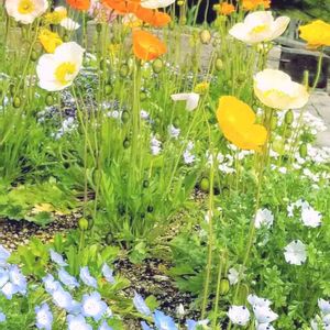 ゆらゆらゆらりんポピーたち♪ ネモフィラさんたちと一緒にいます。 カップのようなお花があっち向いてこっち向いて!小さなネモフィラもあっち向いてこっち向いて! おんなじネ😄やさしい春風が似合います🎵