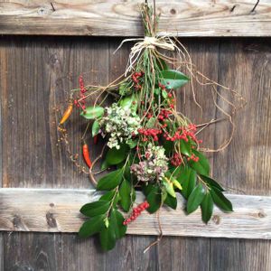 冬のスワッグ出来ました。自家製の実、葉が主体です。ガマズミ、イノバラ、トウガラシの赤に魅かれて作りました。つるはホップ、ヘクソカズラ。この茶色もアレンジに良く合います。